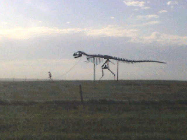 Big Dinosaur skeleton being walked by a human skeleton. This is on the side of the interstate. I had to pull over to get a picture. Who builds these things?