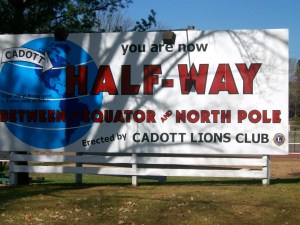 Standing at the degrees of 45 and 90, which means goolash to me, this is halfway between the equator and Santa Claus.  Halfway between that Greenwich line and…I don’t know.  There’s  a billboard and we stopped.