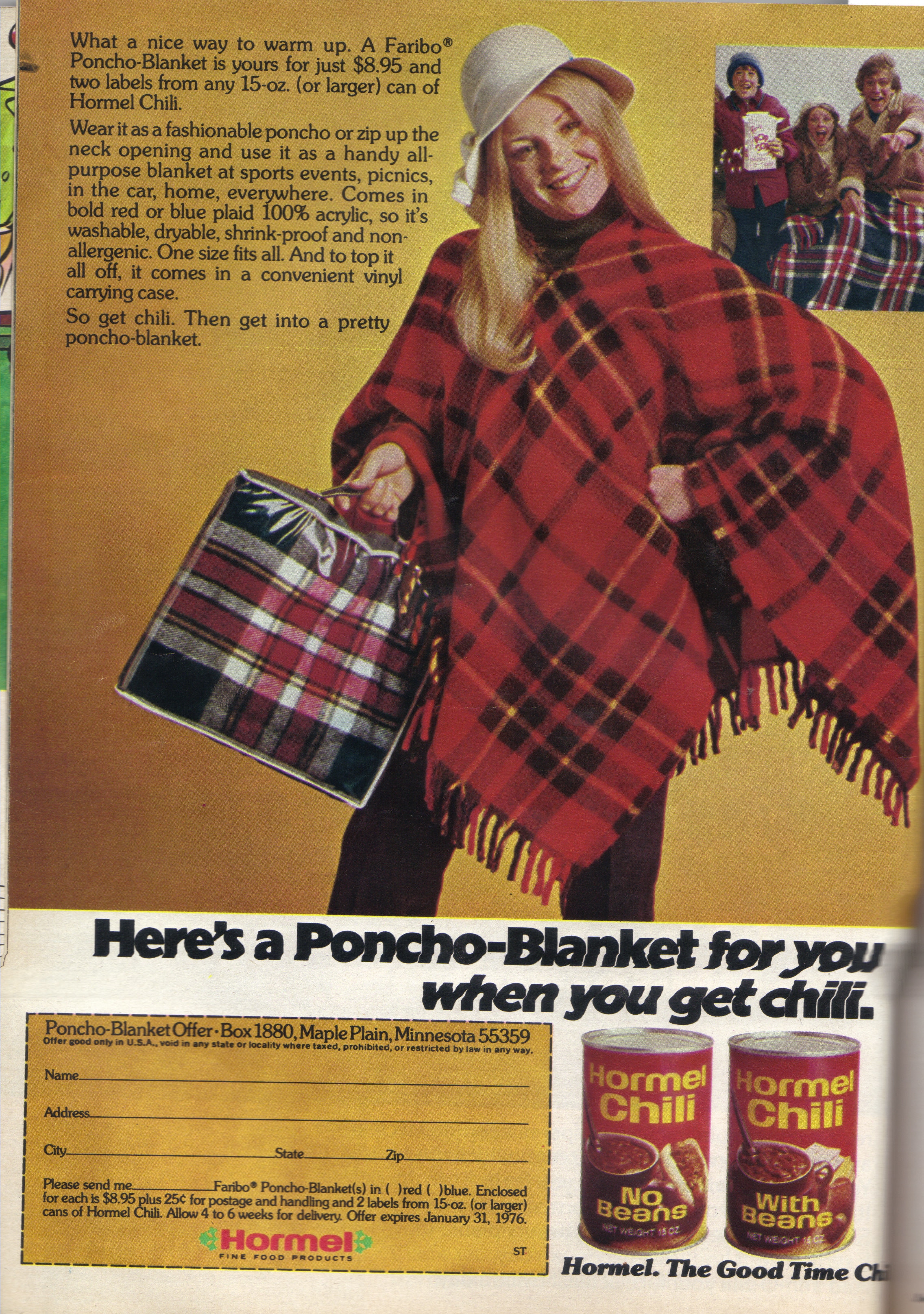 I’m trying to figure out how a poncho-blanket and chili goes together. If you eat chili, then wouldn’t the spiciness warm up the body and the blanket become unnecessary? I get the play on words, but it’s still a stretch.