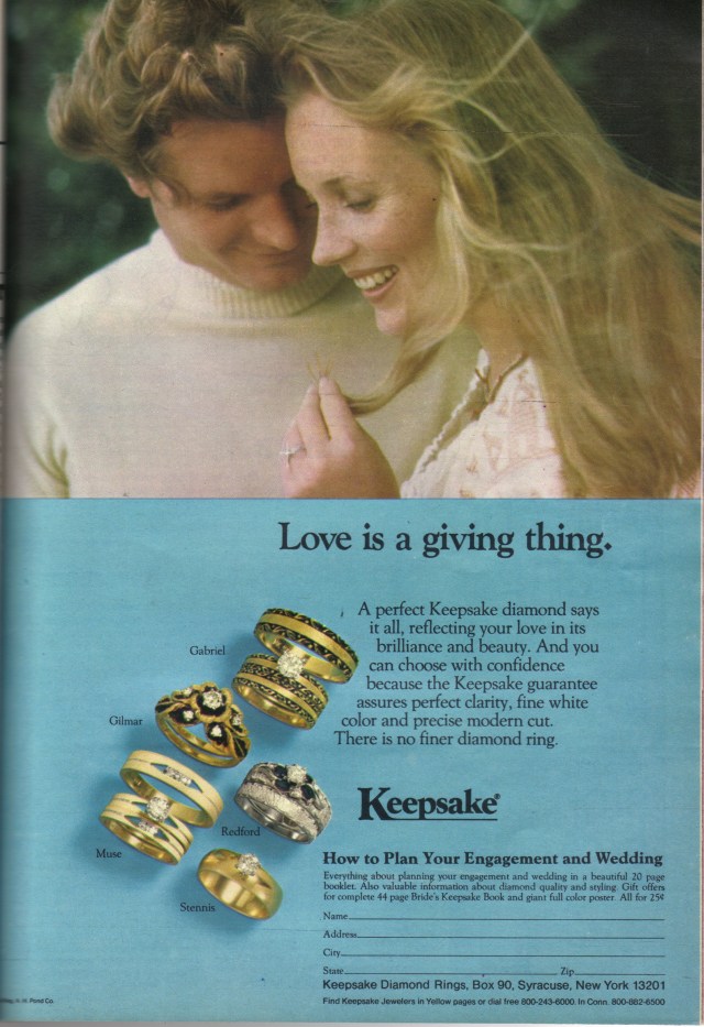 Most noteworthy difference is the abundance of ads geared towards engagement.  I remember this being a high school girls magazine.  In high school parents are typically shoving their daughters towards college or even a job.  Most girls are not looking for their wedding ring.  There were also ads for china patterns, one with a feathered haired girl standing in a meadow with a soft glow effect on the entire picture.  There were an abundance of soft glow pics in this issue come to think of it.  The 70’s were dreamy.