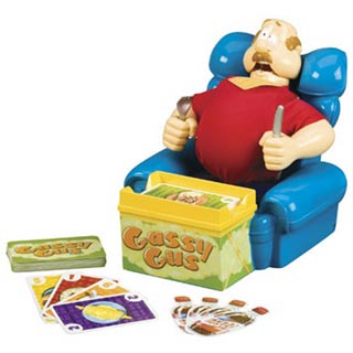 There he is.  The game is simple.  You are dealt cards with foods on them like broccoli and pizza.  Each card has a point value and when you play a card you have to pump Gus’ head.  Pumping his head fills his stomach with gas.  The goal is to get rid of all your cards before you cause Gus to ‘blast gas’.  If, on your turn Gus blasts gas, you are required to take two more cards.  To make the game interesting there are additional cards called “Belly Blaster Cola”.  You can add a cola card to anyone’s turn and they have to add three additional pumps to Gus’ torment.