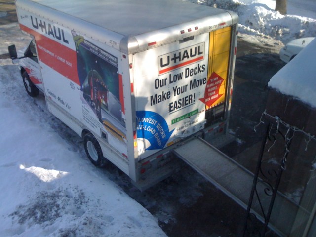 Yesterday, (Thursday) my Full Service Moving Co. with the salesman with the groovy British accent basically let me know that even though they had told me they would pick up my things on Wednesday, they might not come until Saturday.  Or, they might not come at all.  In a panic I dialed me local uhaul to inquire if they could set me up with a moving van that could haul a seventeen year old sedan with extensive hail damage.  They said I could pick it up the next morning.