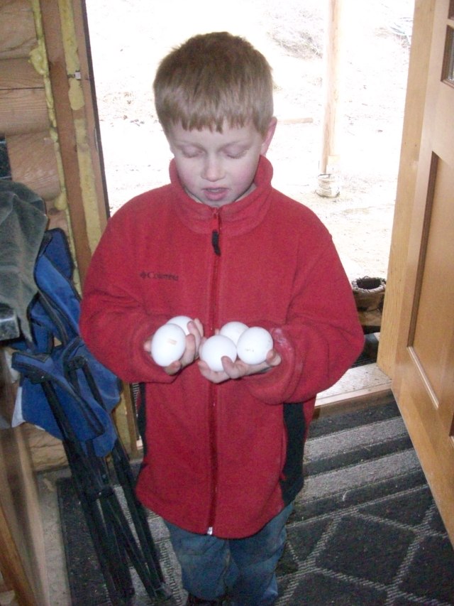 Our first morning started and we climbed the mountain behind the cabin.  My legs burned every step.  At the stop you can see one peak higher that the first and one more peak higher behind that.  I wanna get myself into good enough shape that  can whistle while I easily get to the top of that third tower.  After the hike we ate chicken eggs that were still warm from being layed.  Max really digs finding eggs.