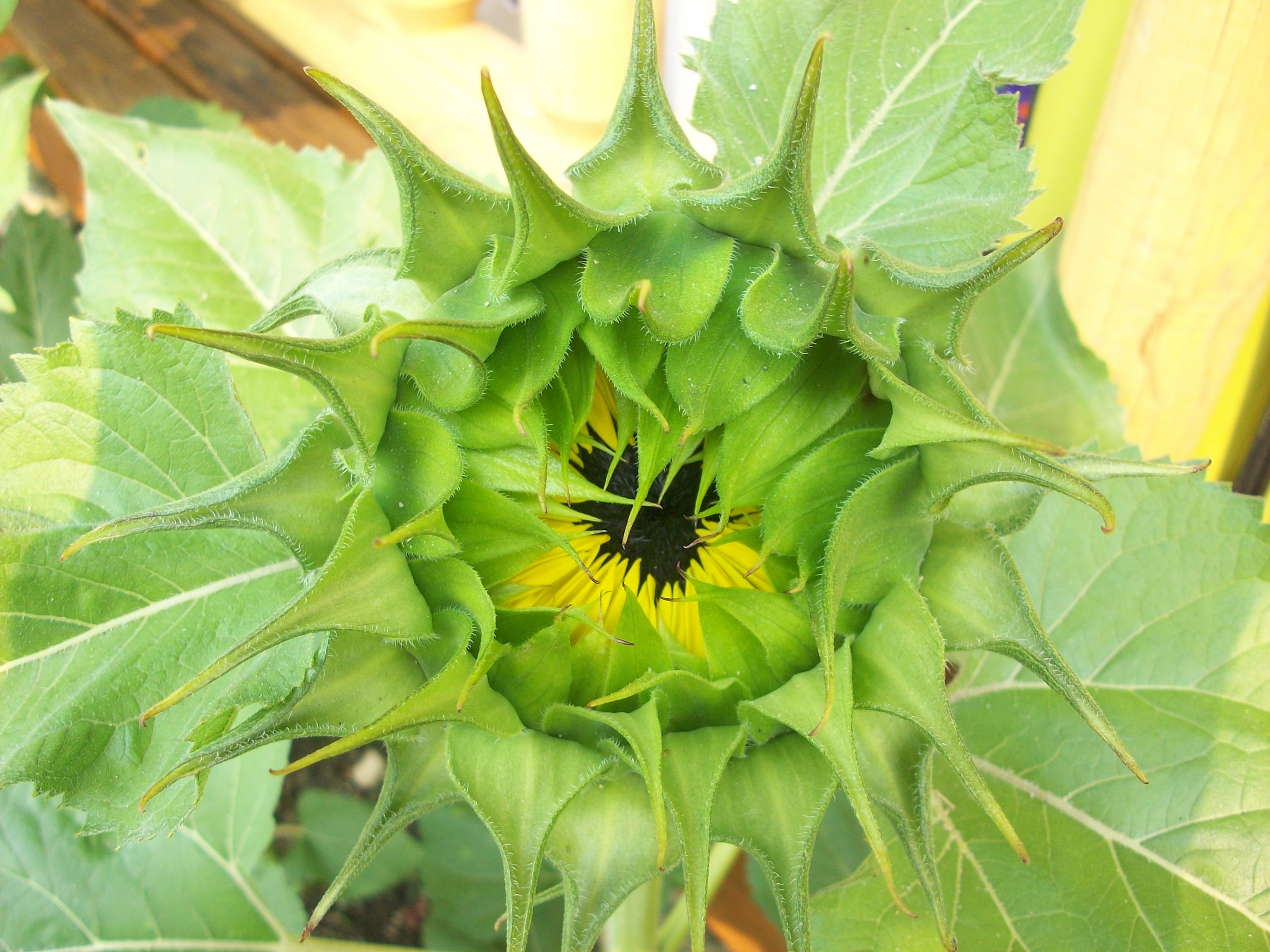 I have over 100 sunflowers growing around the yard. This is the first one that is starting to show some promise of a giant yellow flower head. I love them. Also, the animals cannot seem to find a way to kill them.