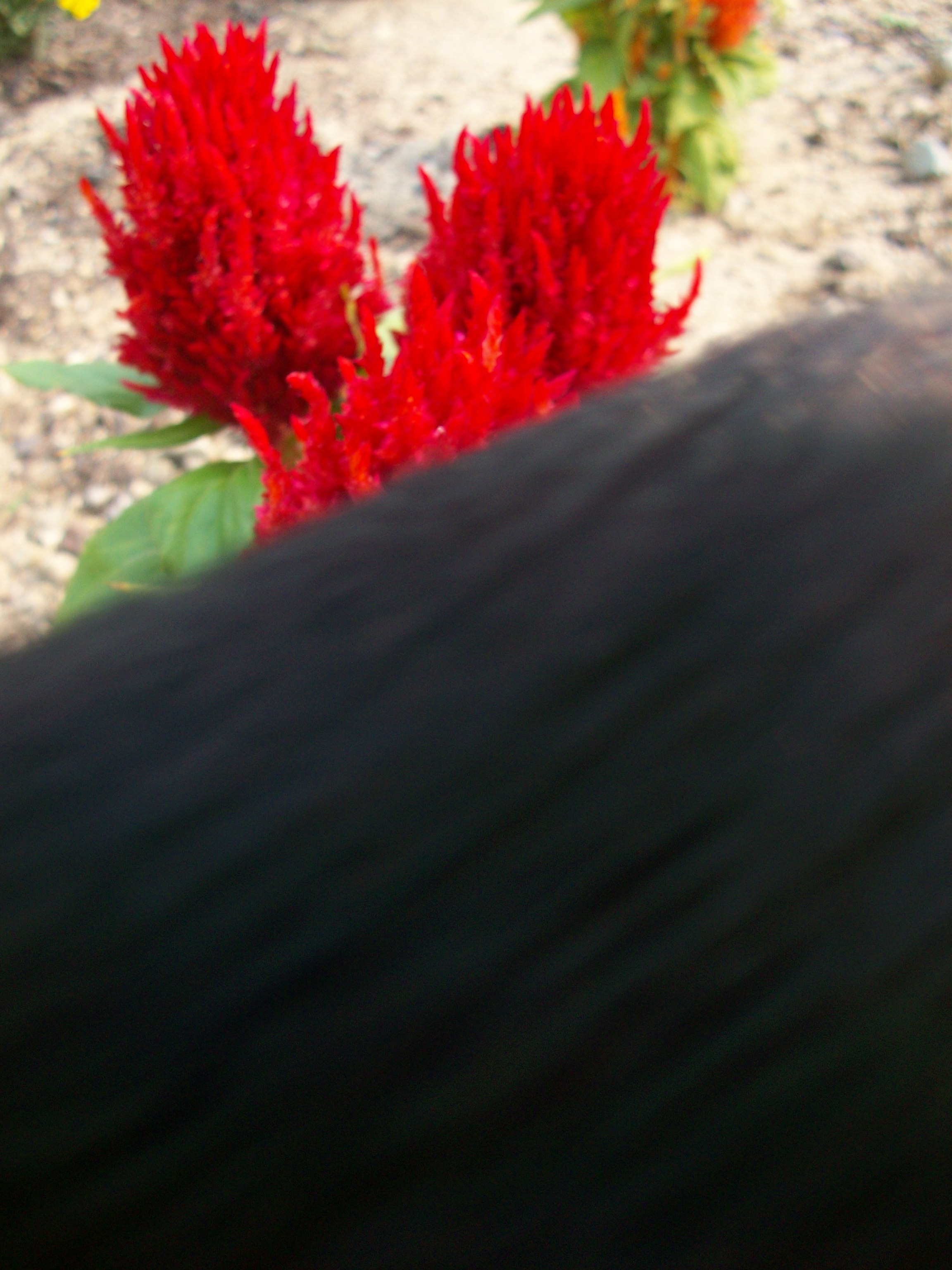 I have one flower bed dedicated to the red, orange, and yellow end of ROY G. BIV. Here’s an unusual flower whose name I could not tell you.