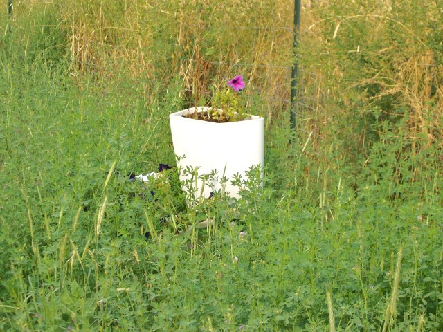 Seems like everyone around here has an extra toilet in their yard. Why should mine be any different? I put a bunch of flowers in ihe requisite broken porcelain throne and placed it in an area that is way over grown with weeds. Thinkin’ I should move it to the front step so more people can look at it.