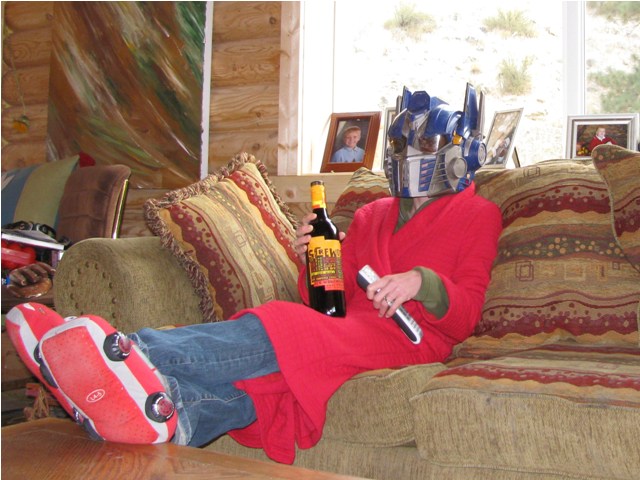 That photo is awesomeness!! I had a chance to purchase the Optimus mask at a yard sale last weekend, but I passed. I thought briefly(which is wierd, because I’m a pretty impulsive buyer when it comes to yard/garage sales), of where I would put it if not in use, and couldn’t come up with anything. The “vault” is pretty packed as it is.