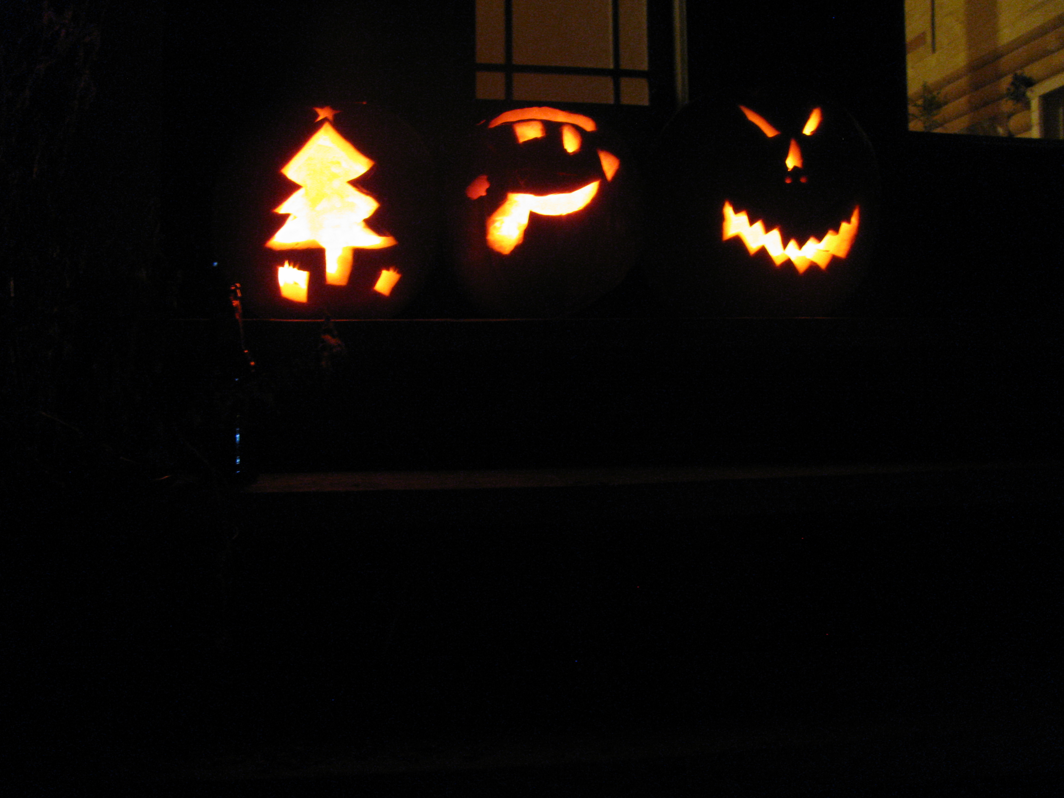 Last night The Pilver household embarked on our annual stabbing of the pumpkins ceremony for Halloween.  We found three pumpkins at the local grocery that were too heavy for their scales.  If you don’t posses artistic talent, bigger is better.  Let me show you the orange orbs glow with the assistance of tea lights.