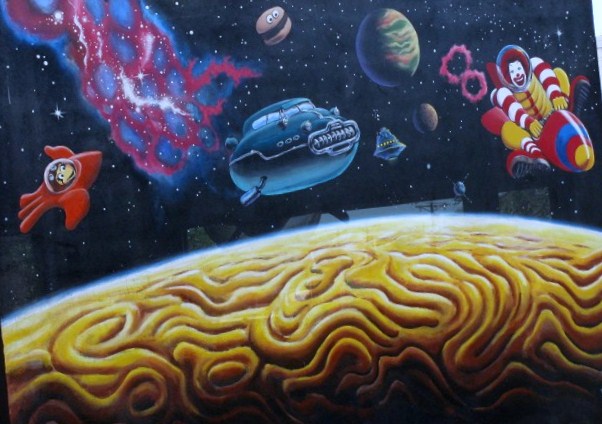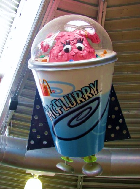 The Mural on the exterior of the building is a good preview of what is inside.  The McDonald’s gang are going to fly around in space and they want you to watch them.