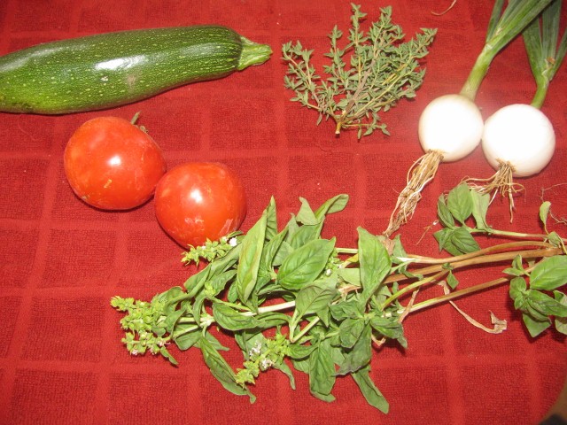 LOOKIT!!!!! I went out to the garden and grabbed some tomatoes, onions, zucchini, basil, garlic, and oregano.