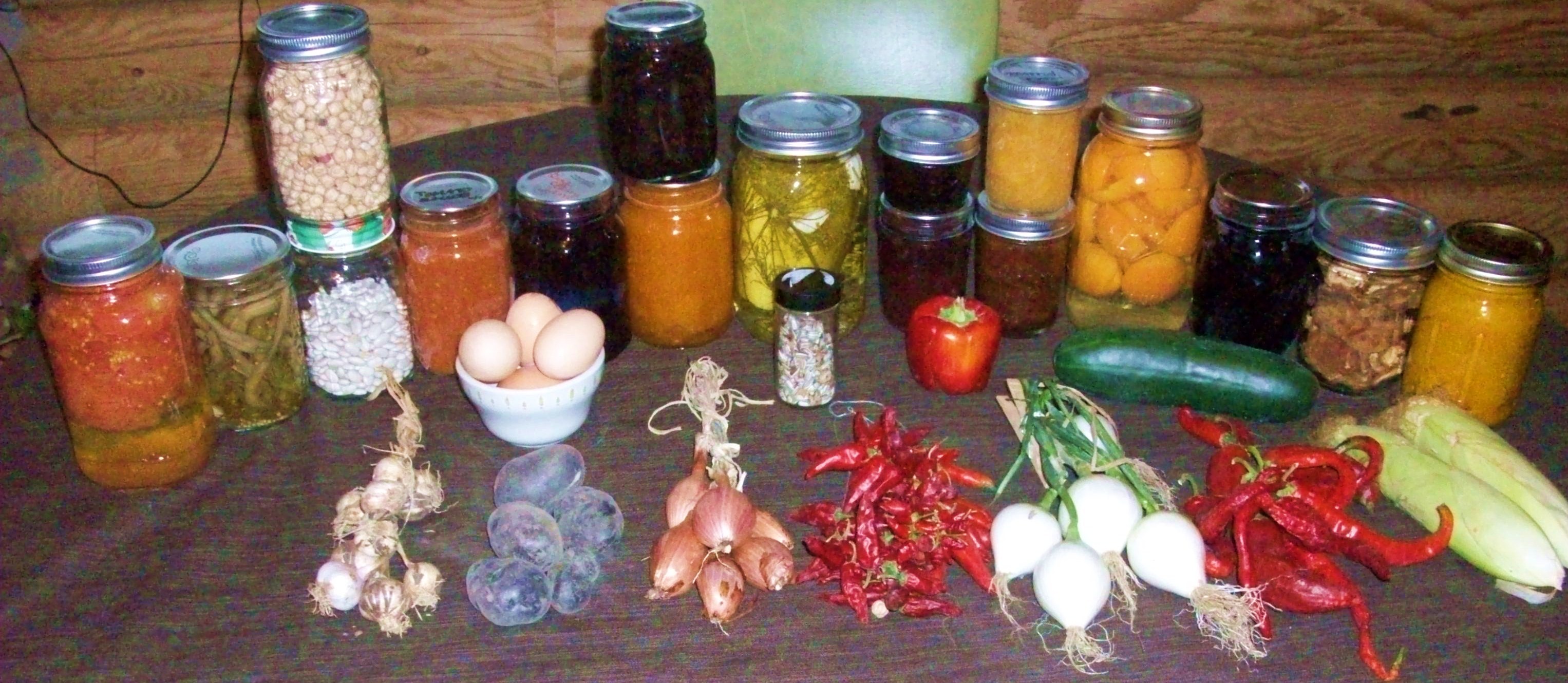 I am going to do my best at naming all this stuff.  From the left: Tomatoes, Pickled Green Beans, Chick Peas, White Beans, Tomato Sauce, Bing Cherry Jam, Huckleberry Jam, Peach Preserves, Pickled Cucumbers, Service Berry Jam, Rhubarb Apple Pie Filling, Apricot Jam, Cherry/Peach Syrup, Apricots, Elderberry Jam, Dried Apricots, Canned Pumpkin, Bottom Row: Garlic, Eggs, Blue Potatoes, (we also have red, russet, yellow, and white) Shallots, Thai Chili Peppers, Sunflower Seeds, Bell Pepper, White Onions (we also have red and Yellow), Cayenne Peppers, Salad Cucumber, Corn on the Cob…whew!