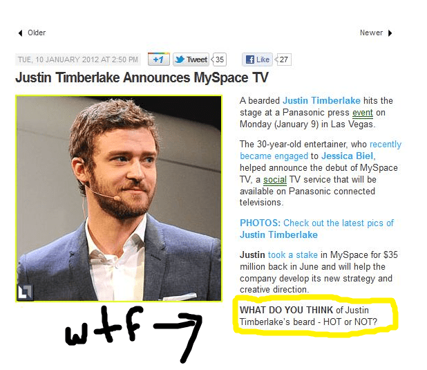 Justin Timberlake apparently is working for MySpace. He is trying to get it going in a new direction, being as it is an unused social networking site at this point. Thankfully I never deleted my account and I can zip back there any time I want, which at this point is never. But forget about MySpace for a minute. Look at the conclusion of the article. The final thought the author of this story wanted to leave you with: