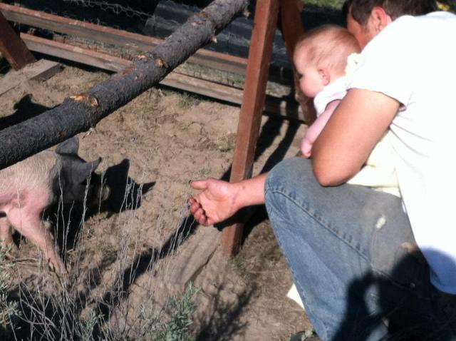 Lucy meeting Bacon.  Our rule is if we name the livestock, we must keep their titles realistic.